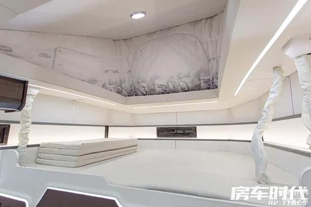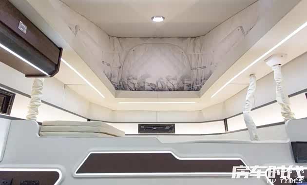 车厢最前方为额头床,尺寸为1900×1500mm,将额头区域的升顶结构展开后,可以带来充裕的纵向睡卧空间,大大提升了用户睡卧的舒适度。额头床内侧软包设计了水墨装饰,进一步提升了车厢内部的典雅氛围。