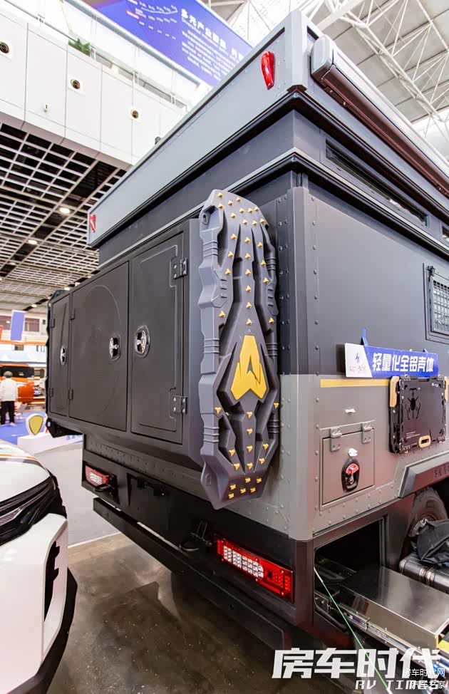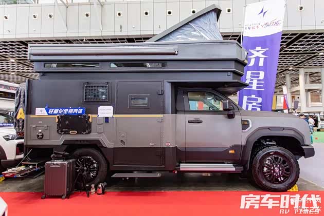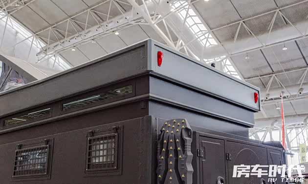 车辆外观以深灰为主,车身线条刚毅,充满机械和力量感,装配有房车越野专用车门(带纱门)以及3个侧推拉窗(带窗帘窗纱),整体性十足。