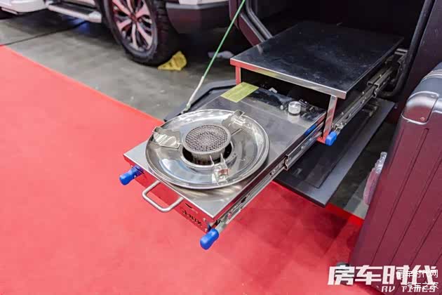 外侧附有折叠桌板、遮阳棚(3m)、室外LED照明、抽拉柴油灶、电动脚踏板以及尾置悬挂式储物舱,精致实用,整体呈现硬派且质感的越野气质。