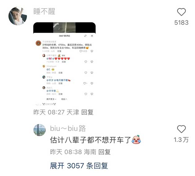 先看网友们最关心的话题:定损价格。目前流传最广的便是以下这个说法:沙特龙的车,4700w,最后定损406w,保险出300w,别克女车主出106w,车运回瑞典修。看似十分完善周全的定损信息其实疑点也不少,至少就这个定损速度来说就存疑。