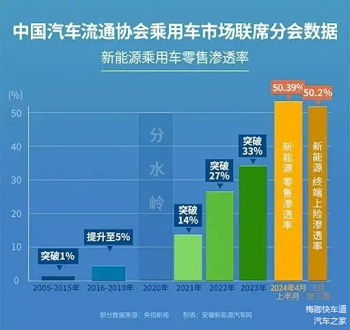 2024年7月份,新能源汽车零售销量占比达到50.84%。这一历史性时刻标志着新能源汽车超过传统燃油车真正成为市场主流。从具体数据来看,在2024年4月上半月和5月第三周,国内新能源车零售渗透率已首次突破了50%。到了7月份,这一趋势得到了进一步的巩固和扩大,使得整个7月份成为新能源汽车渗透率首次完整月份突破50%的历史时刻。