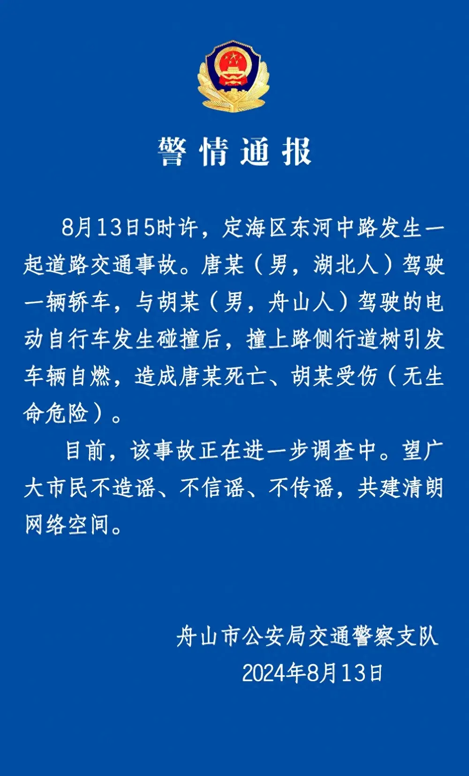【“浙江通报‘一轿车与电动自行车碰撞后撞树自燃’:轿车车主死亡,电动自行车车主受伤无生命危险”】