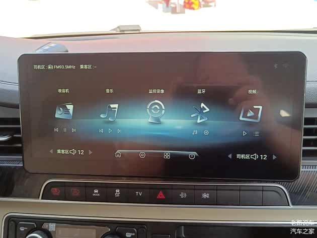 仪表台上设计有一块中控大屏,可操控音乐、收音机等多种功能。中控区可实现Carbit手机互联,同时前后舱多媒体系统互相独立,可单独分区操控。司机去听广播或语音电话,不影响乘客区电视播放。