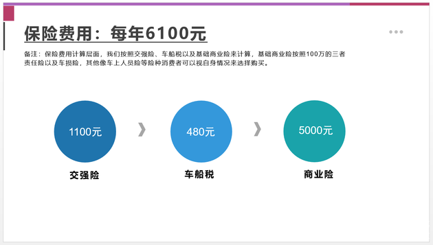 保险费用计算层面,我们按照交强险、车船税以及基础商业险来计算,基础商业险按照100万的三者责任险以及车损险,其他像车上人员险等险种消费者可以视自身情况来选择购买。我们的价格不考虑多年不出险的市场折扣价。