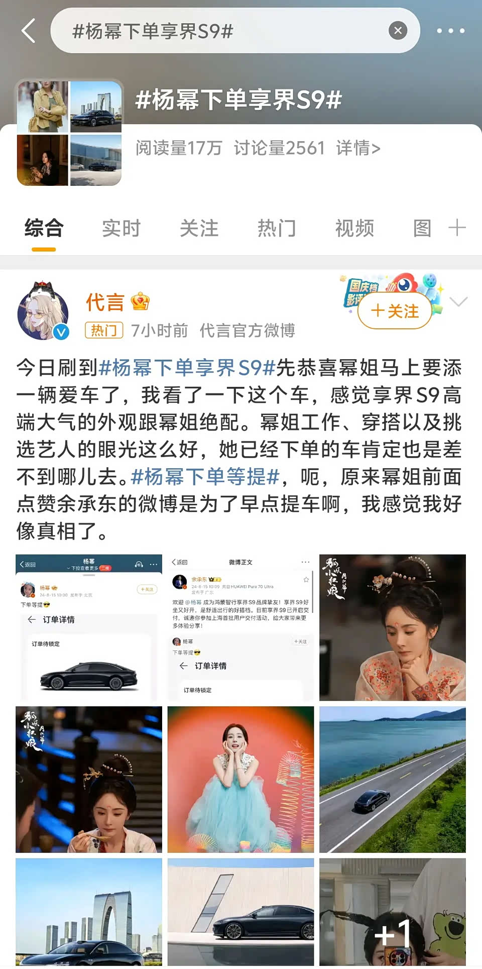 从这可以看出这个大概率是享界S9的推广,其实从流量的角度是可以理解的,毕竟杨幂是娱乐圈的初代顶流,即便到今天战斗力也很强,目前杨幂下单微博下的评论量达到4万,转发19.8万,点赞73.7万。
