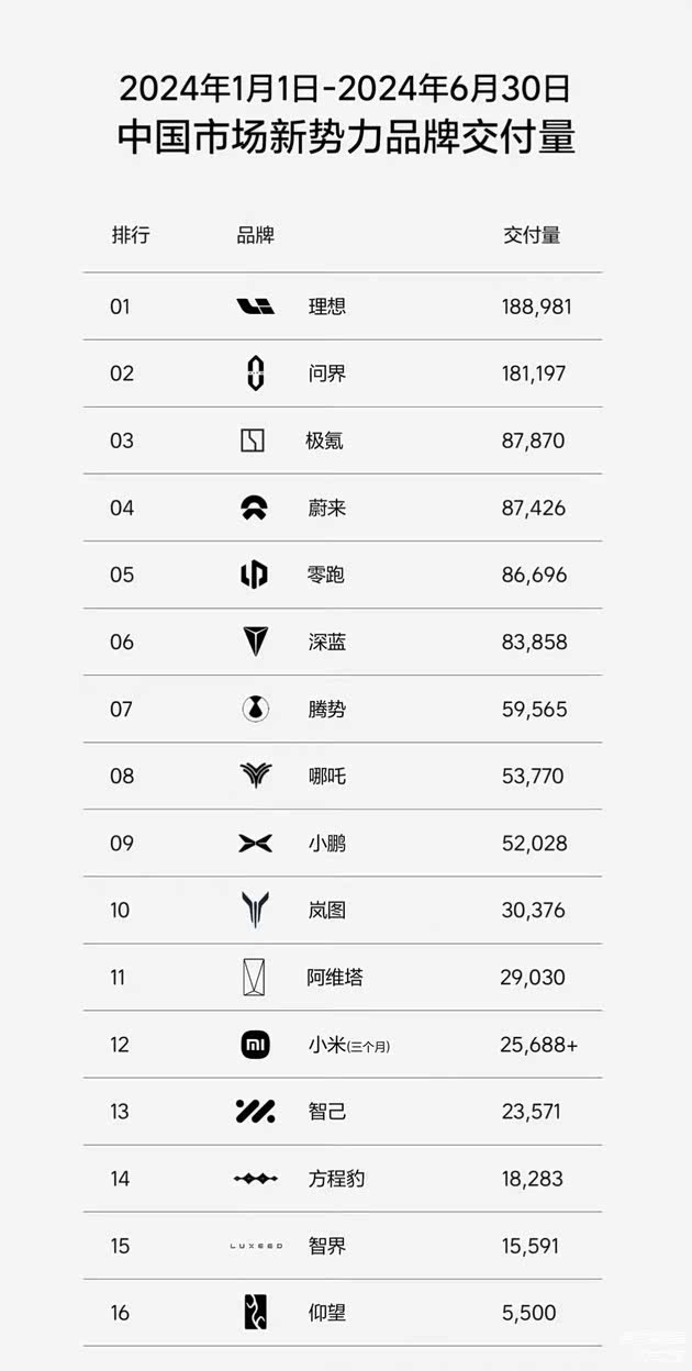 一个月前,曾有一份《2024 年上半年中国市场新势力品牌交付量》的榜单流传,与往年的市场格局有所不同,我们能从这份榜单中看到更多纯电车企向上的身影: