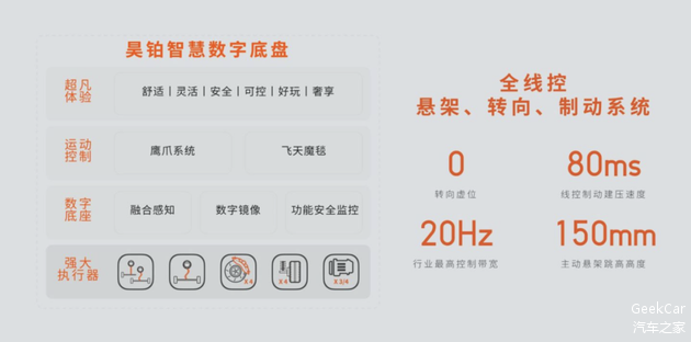 比如,昊铂这套智慧数字底盘就与 EEA3.0 电子电气架构深度融合,悬架、转向、制动、驱动系统全面线控化,不再受机械连接的限制,「大脑」也能调配更多模块来配合。