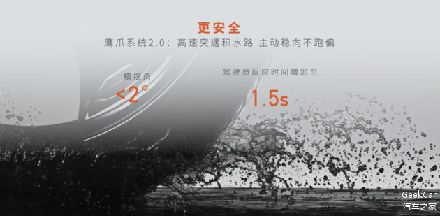 要解决这个问题,就需要底盘能及时检测路况,发现积水,同时迅速调整车轮的扭矩。昊铂智慧数字底盘的鹰爪系统 2.0 就起到了这个作用。通过 40 多个车载传感器的实时检测,第一时间发现路面的积水,然后迅速调整车轮扭矩,让车轮牢牢抓住地面。再这一系列操作下,鹰爪系统 2.0 能让车辆遇到积水路面时的横摆角小于 2 度,避免出现侧滑,同时给驾驶员争取来了 1.5s 秒的反应时间,不至于遇到水坑措手不及。
