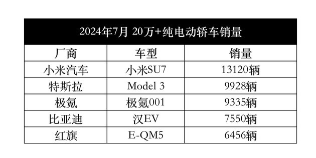 不得不说,“米家军”确实给力,对雷总带领打造的小米汽车首款车型—— 小米SU7,绝不是什么口嗨式支持,而是拿出实际行动。这不,从最新的2024年7月销量数据来看,在20万级纯电轿车市场,小米SU7就以月销13120台的战绩,超越特斯拉Model 3,稳坐该细分领域销冠席位。