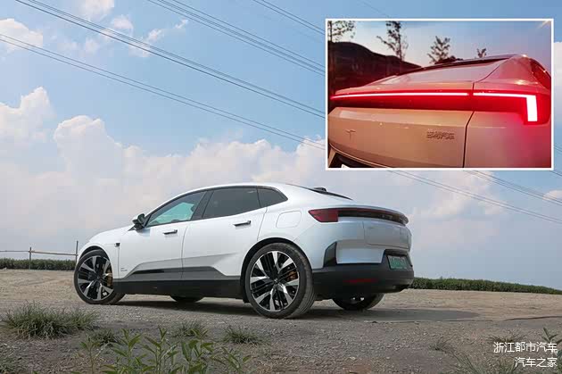 极星Polestar 4的尾部设计与前部相呼应,也是简约的设计。车顶线条由顶部向尾部进行内收缩,特立独行的封闭式尾窗,以及提升颜值的“冖”样式的尾灯造型横跨整个车尾,在夜晚之下,非常有辨识度。也让整车的尾部的俯冲姿态显得动感十足。