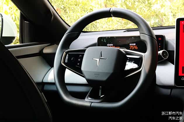 极星Polestar 4在方向盘方面,仍然同样采用了三幅式方向盘设计,方向盘两侧使用了触控按键形式,左侧为辅助驾驶区域,右侧为多媒体区域。