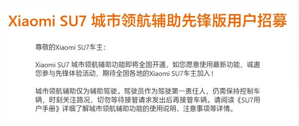 8月21日,小米官方宣布备受期待的 小米SU7城市领航辅助功能将很快在全国范围内得到应用,同时启动了城市领航先锋版的用户招募。这一功能的上线标志着小米在智能驾驶领域迈出了坚实的一步。