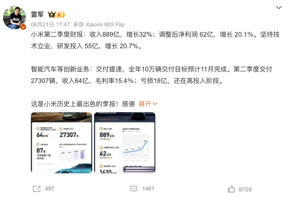 小米集团发布了史上最出色季度财报,盈利大涨20%,小米汽车的经营情况也顺便披露了,虽然还在高投入阶段,依然亏损,不过达到预期。