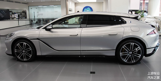 车身侧面,采用了短前后悬和长轴距的设计,整个车身呈现出低重心姿态,车身比例优雅。隐藏式门把手、无框式车门和电吸门等细节设计无一遗漏。大尺寸的轮圈搭配黄色卡钳,车身轴距为3125mm。