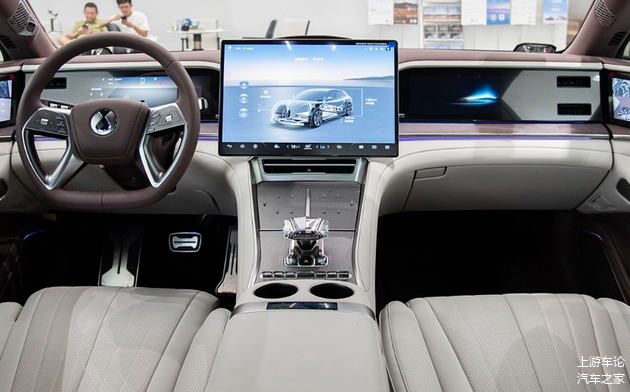 进入车内,新车采用了对称的设计和环抱式布局,配备128色车内氛围灯,并使用大面积的软包材质,营造出豪华的氛围。