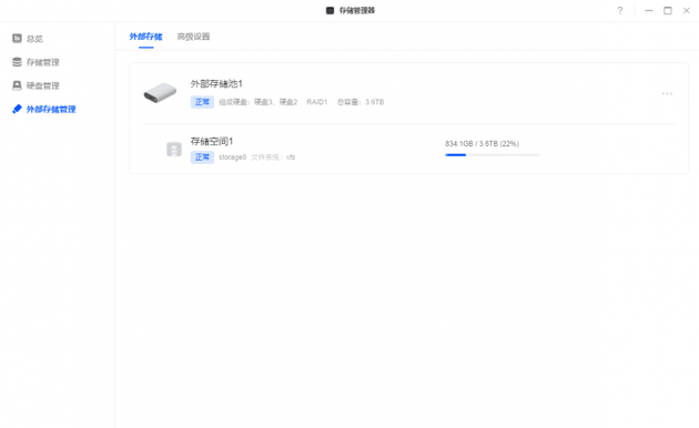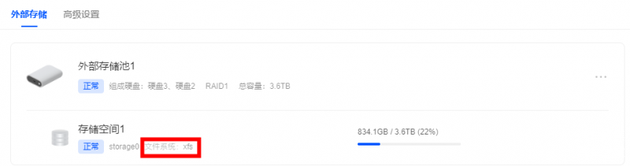 安装好后,可以在外部存储管理看到可用的存储空间,文件系统是默认的xfs。