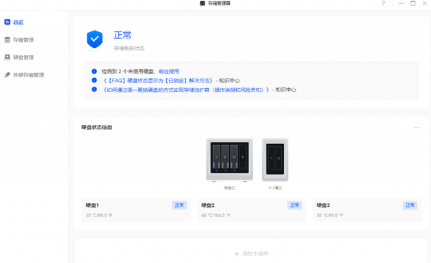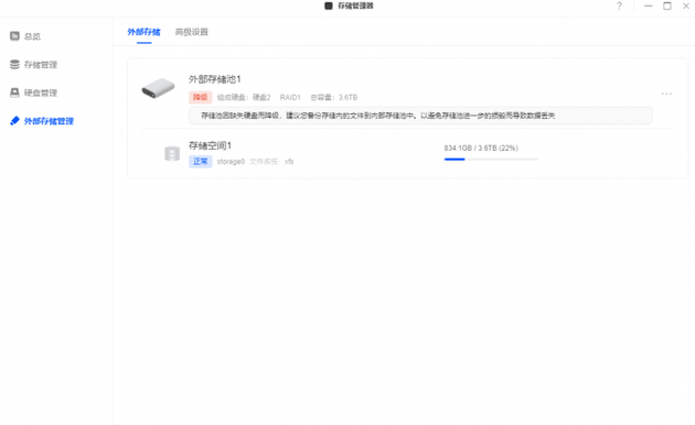 如果你只用其中一块硬盘做外挂存储,DXP4800会因为这种操作对硬盘数据安全有一定的影响,而发出蜂鸣声进行提示,所以为了数据安全,还是更建议大家保持原有的RAID模式。