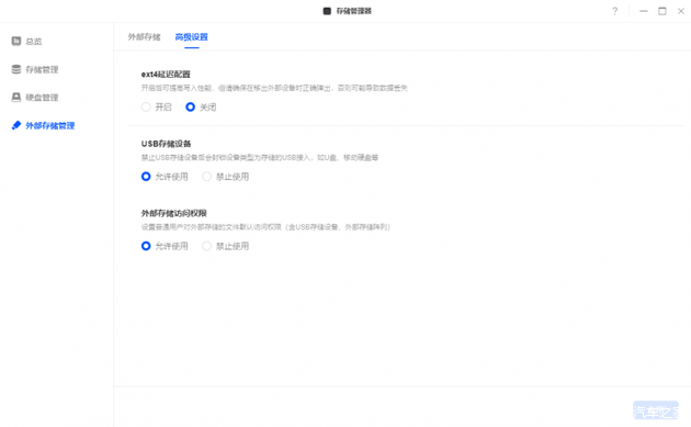 高级设置中可以设置普通用户对外部存储的访问权限,开启ext4提高写入性能等等。