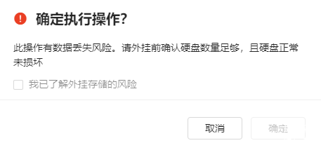 我们选了外挂存储之后会出来一个风险提示,里面提到请“确认硬盘数量足够”指的是如果你在旧设备用两块硬盘组了RAID1,那么你要将两块硬盘都转移过来。