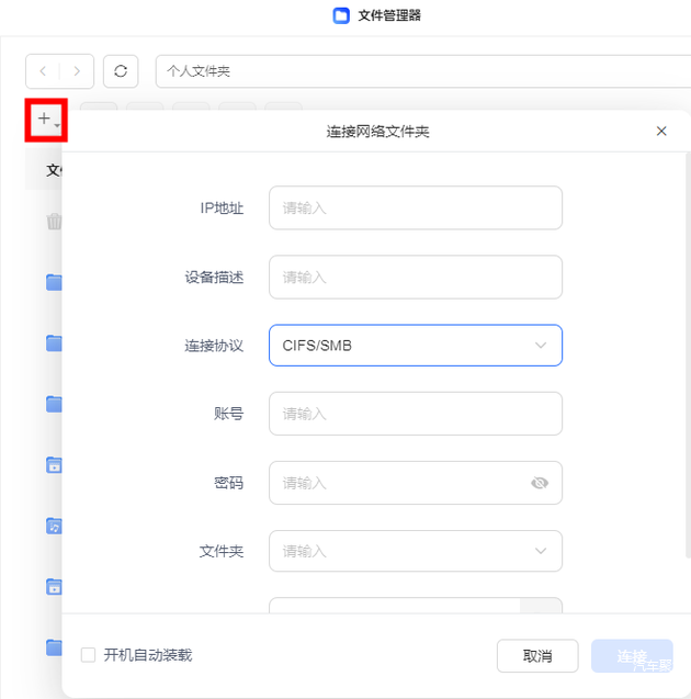 打开DXP4800的文件管理器,点击“+”号,选择连接网络文件夹。