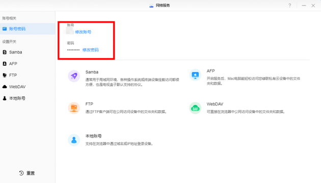 打开网络服务,查看自己的本地账号及密码,如果没有就先开启设置一下。