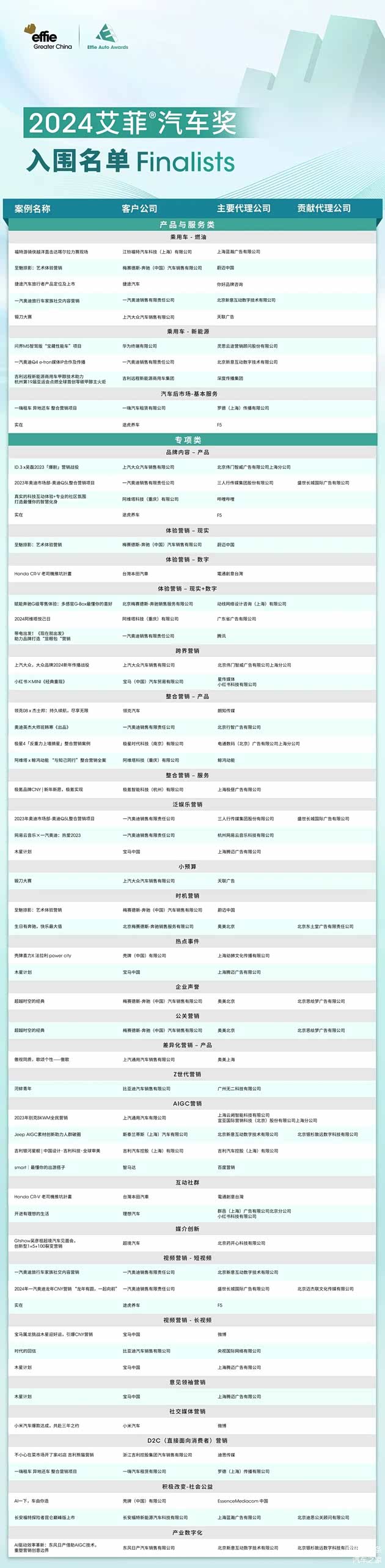 特别感谢百余位初审评委专业严格的评审,2024艾菲汽车奖最终诞生了58件入围案例,恭喜所有入围单位!