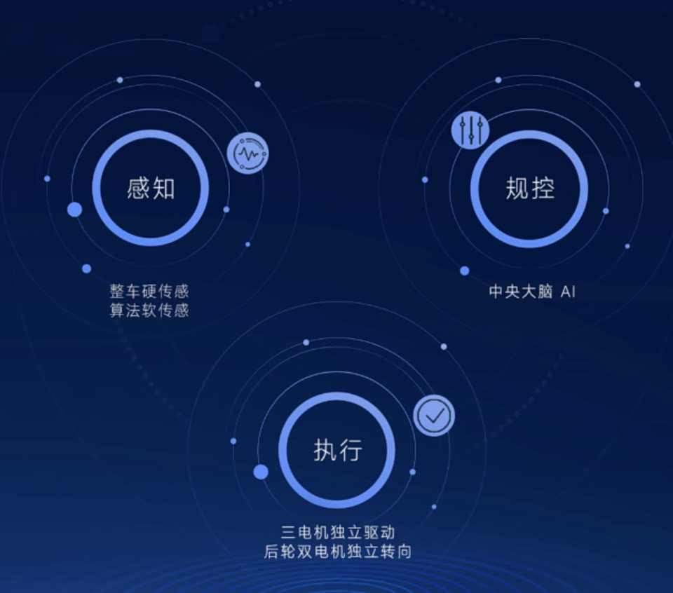 (4)低附着力路面增稳系统在冰雪或者湿滑路面,传统汽车容易打滑失控。易三方的这套系统,可以通过后轮独立控制和后轮转向减轻可能发生的侧倾和打滑,从而提升行车的稳定性。
