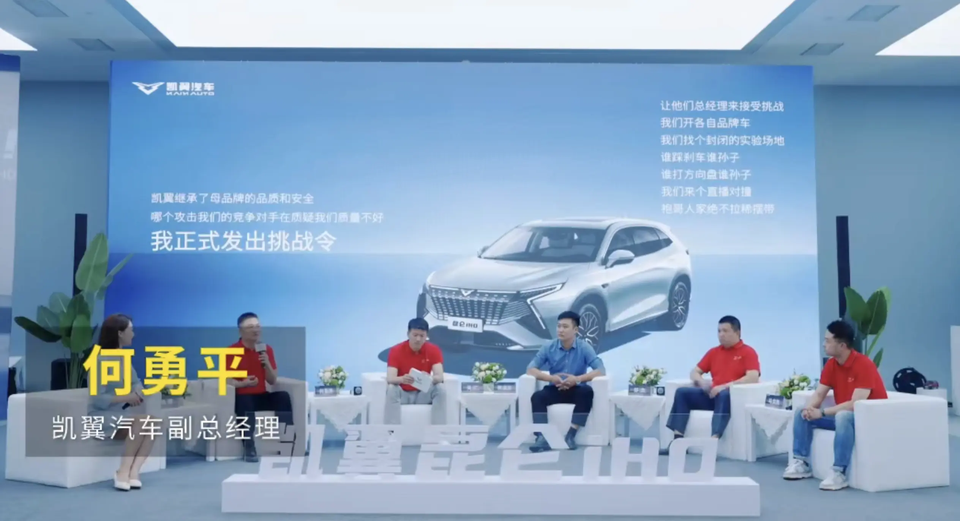 “谁踩刹车谁孙子,谁打方向盘谁孙子。我们来个直播对撞,看谁干得赢。” 这是开辟“斗狠对撞”新的营销赛道啊! 凯翼汽车副总经理何勇平真的是性情中人,向质疑凯翼品质不好的品牌/竞争对手发出了“挑战令”。 这是在凯翼昆仑iHD上市发布会的直播中曝出的言论。 凯翼这个品牌估计很多人都没听过,旗下车型月销基本也就400-600辆的水平。