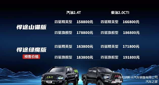 5月23日,新款江淮 悍途山猫版/绿魔版正式上市,分为2.0T和2.4T共推4款车型,其中,山猫版是由江淮皮卡与越野兄弟俱乐部深度共创的硬派越野皮卡,而绿魔版则是基于山猫版升级而来,搭载川崎绿色套件,在车标、雾灯区域、门把手等细节部分采用亮眼的绿色涂装。售价15.88万元-18.68万元。