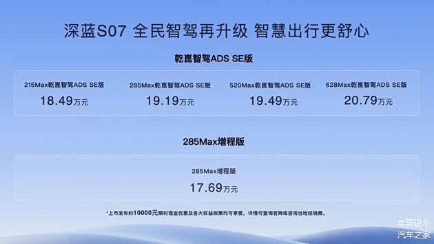 8月25日,深蓝汽车又搞了一波大动作。 深蓝S07的智驾版车型在上市不久之后就开启了限时优惠。其中,深蓝S07 285MAX增程版,限时优惠3000元;深蓝S07乾崑智驾ADS SE版,限时优惠5000元。