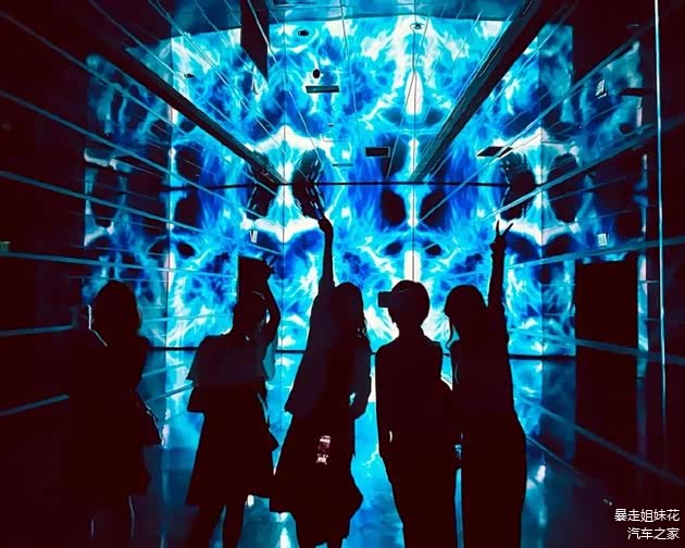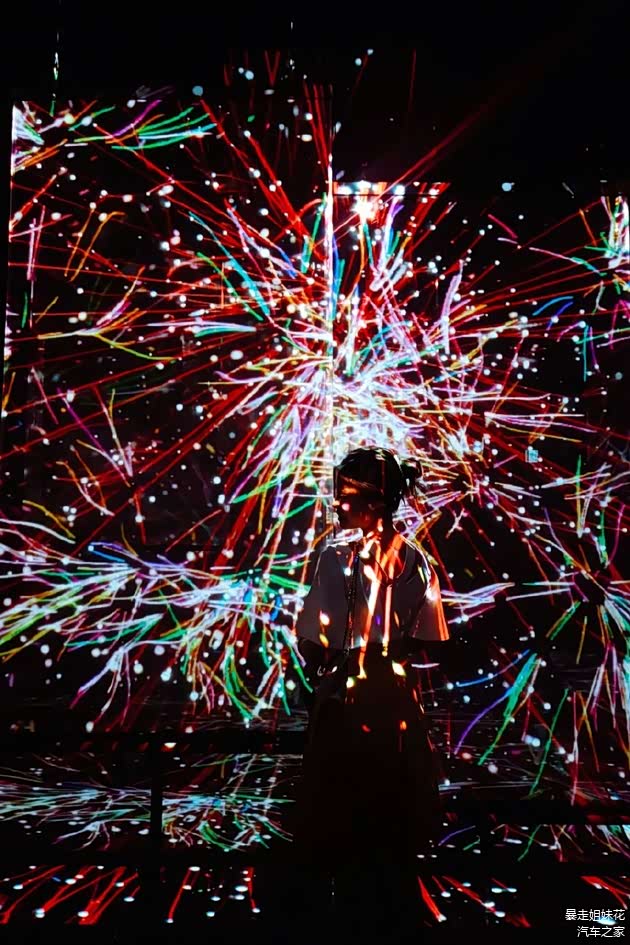 如其中一个展览空间——“Imagine 想象”,房间四周展示着想象中的奇异生物,房间摄像系统可捕捉参观者的动作,让屏幕中的主角们也跟随着翩翩起舞。而在“Emotion 情感“展览空间则可根据参观者的表情做出璀璨的火花反应,花花收获的是神秘莫测的紫色烟火。