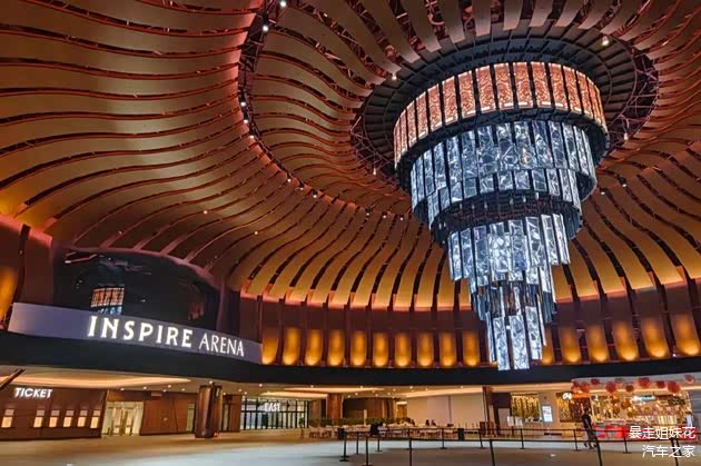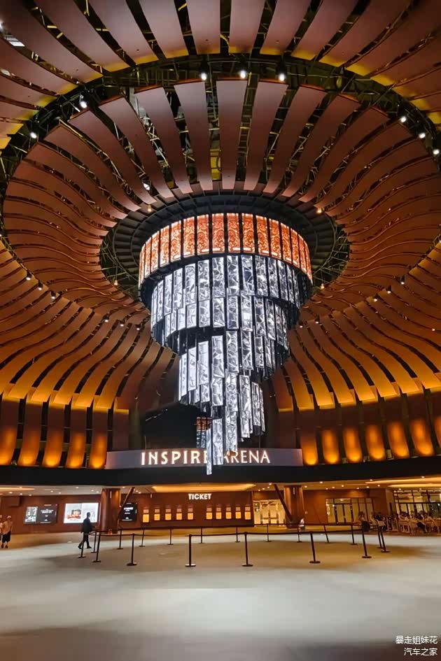 穿过极光道便到达环形大堂,抬眼就会被巨幅的动感LED吊灯吸引,每逢表演时间,吊灯或分层或组合,充满动感地展现着不同的数字艺术片。这里也是迎仕柏综艺馆的入口所在,作为韩国首个多功能室内演出馆,这里的“威水史”可不少呢!