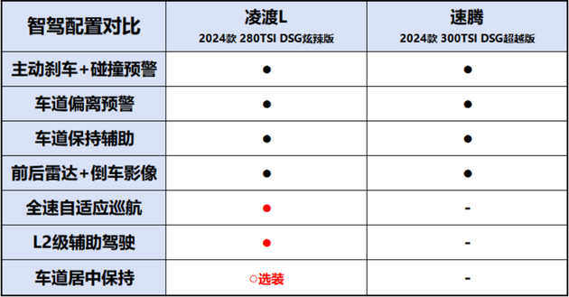 坐着宽敞舒适、用着智能便捷,那么开起来能否安全有力?在安全性配置方面,凌渡L与速腾均搭载了同级领先的7安全气囊配置,并且像主动紧急制动、车道偏离预警、前后雷达、倒车影像等智能驾驶辅助功能均未缺席,都可以为全车乘客带来最周全的硬核守护。不同点在于,凌渡L搭载了全速自适应巡航功能,使其拥有了L2级辅助驾驶能力,并且还支持选装更高阶的Travel Assist智驾系统,能更好的兼顾日常通勤与长途出游的全方位需求。反观速腾,虽然主流智驾功能一应俱全,但和凌渡L这种“高智商学霸”相比就略显逊色一些。