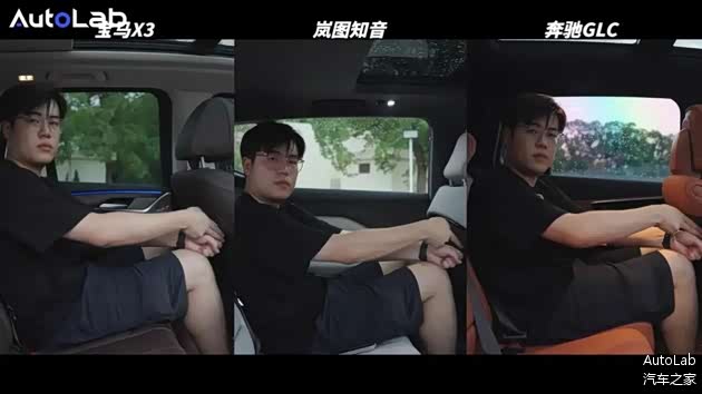 身高185的Jim将前排调整为他合适的驾驶坐姿后,来到后排,三台车的乘坐空间如图所示。虽说知音的轴距相比最长的GLC差了77mm,但实测下来的差距算是微乎其微。