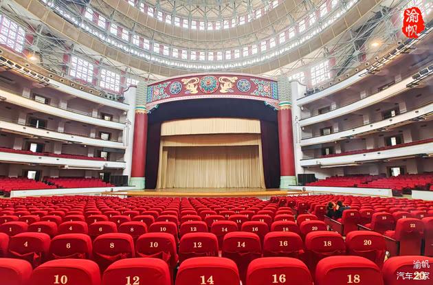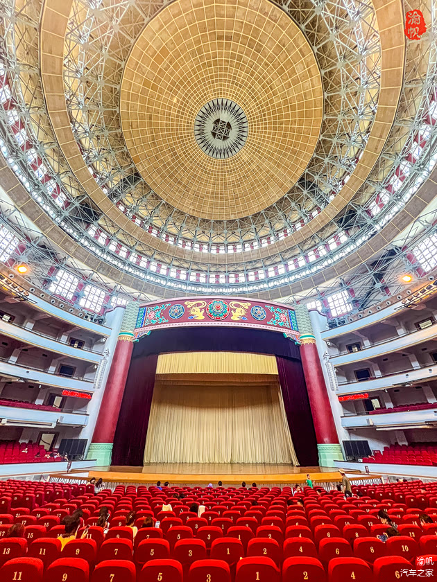 重庆人民大礼堂位于渝中区的人民路173号,坐东朝西,由中心礼堂和南北楼组成,其外观设计有明显的明清宫殿特色,以中心礼堂为中轴线对称布局,中间的主体参照北京天坛祈年殿,上面部分又有天安门的痕迹,展示了中国传统建筑的宏伟与庄严。内部空间呈圆形穹顶,高敞雄阔,自然采光通风,是实用性与美学的完美结合。