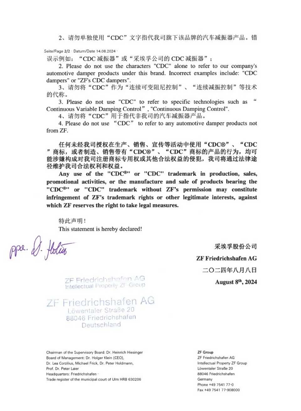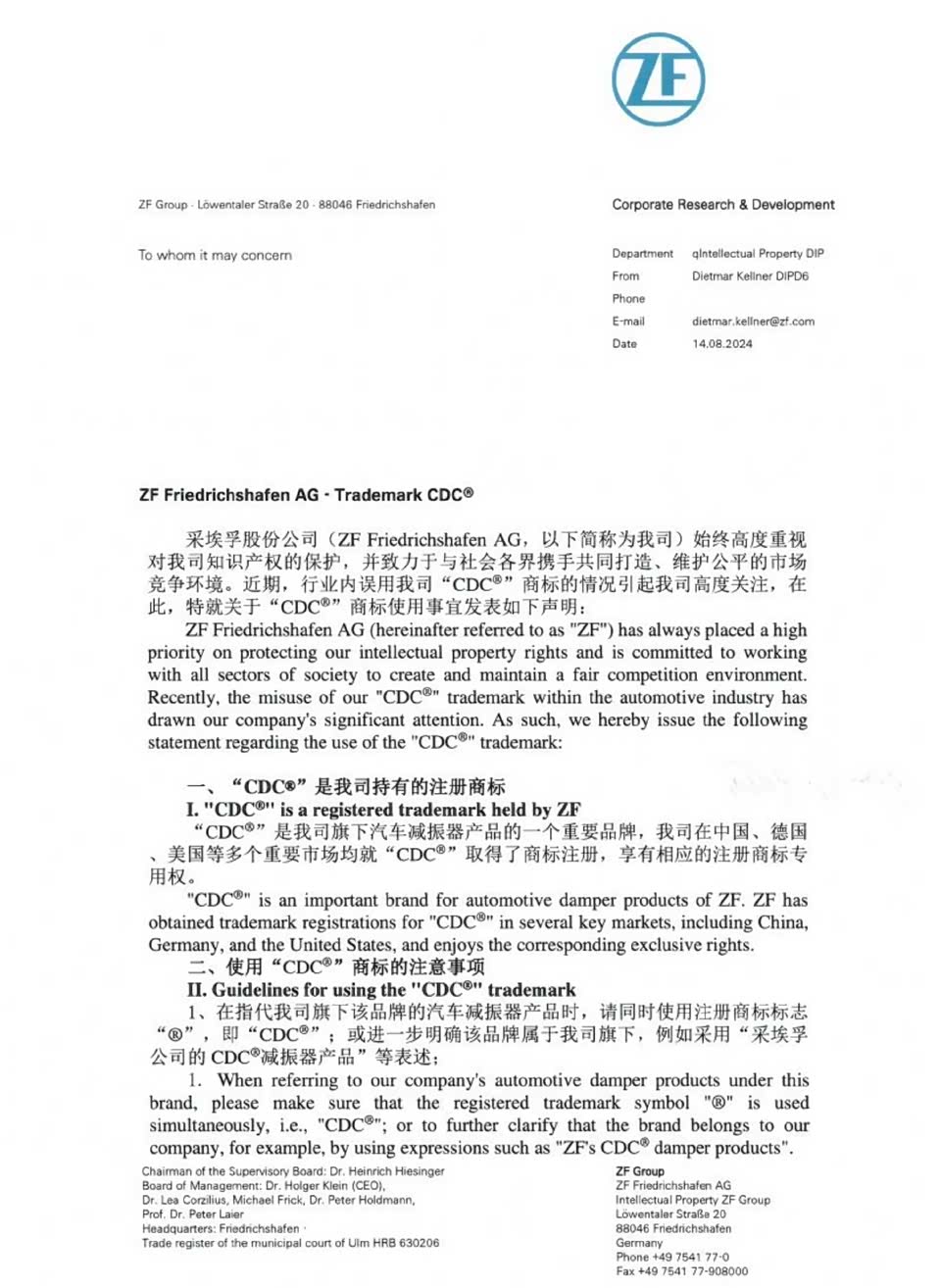 本家不乐意了。ZF,也就是采埃孚,零部件巨头之一。发公告,意思是CDC是我ZF的,是旗下汽车减振器的一个品牌。在中国,德国,美国等大市场都有申请注册商标专用权,未经同意不能在生产、销售、宣传等活动中说“CDC可变减振器,可调阻尼等等”。这种事情本家较真也没毛病,特别是车企在发布会或者新闻资料中都应该标注清楚。 类似的情况,博世也有,ESP是博世的,其他供应商叫法也很多,什么ESC,VSC等等。网络流量时代大家博眼球,喊个响亮亮的口号也是方法之一,正确的事儿就正确的做,让别人挑不出毛病。