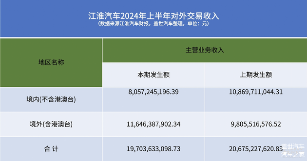 从销量角度来看,江淮汽车2024年上半年累计销售20.62万辆整车。其中,新能源乘用车表现抢眼,销量同比增长15.28%。此外,江淮汽车境外销量虽然仅6万余辆,但营收贡献却超5成。
