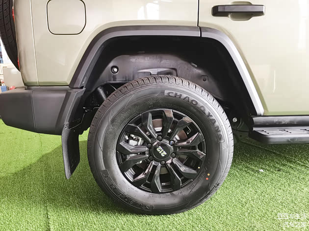 轮胎采用的是17寸的黑色铝合金轮毂,(最高配的为18寸的双色轮毂),轮拱设计的很高,便于后期轮胎的改装。这次的选装包,越野包有AT胎可供选择。
