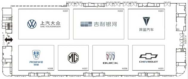 二号馆,参展品牌:上汽大众、吉利银河、深蓝汽车、荣威、MG名爵、别克、雪佛兰