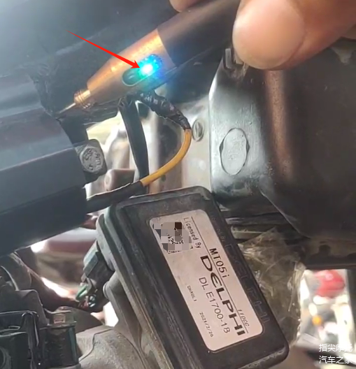 然后就是插上插头测信号,恢复高压包的供电和信号插头,使用超级试灯插入高压包信号输入端,在启动过程中,如果有输入信号,超级试灯的指示灯应该连续闪烁,但从测试过程看,超级试灯的指示灯常亮,没有闪烁,说明没有点火信号。