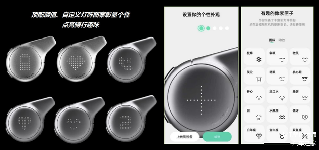 比起头盔蓝牙耳机变色,极蜂Q的DIY个性像素灯阵,确实“爱了”,有点像春风XO狒狒高配的侧面LCD数显屏幕,通过手机APP可以预设或自由编译,同时支持动态和静态两种展示形式,个性十足。除此之外,设计和底座安装也是十分方便,轻轻旋转“6”一下即可!采用快拆结构、触点式连接,单手就可以操作。