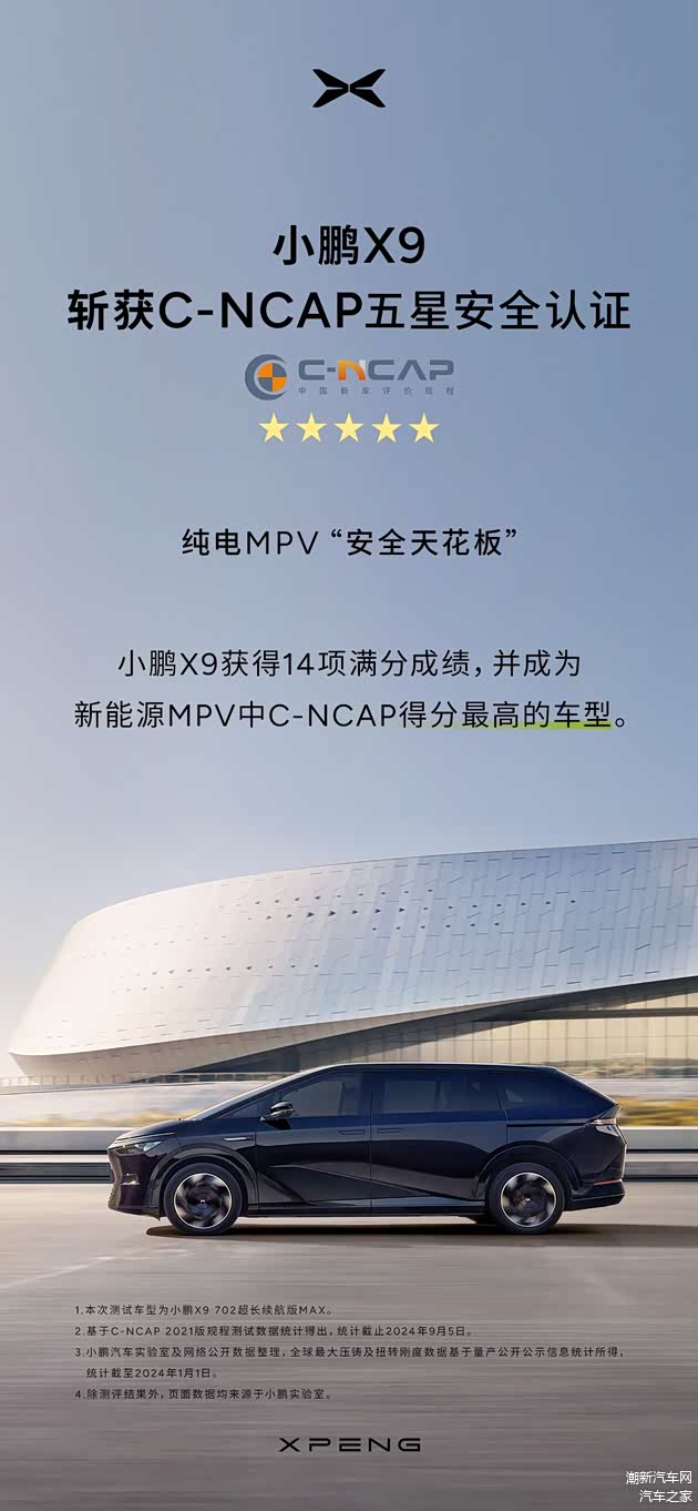 近日,小鹏汽车旗下首款高端纯电MPV—— 小鹏X9完成了中国新车评价规程(C-NCAP)测试,并且以优异的成绩斩获了“五星安全认证”,小鹏X9成为新能源MPV中得分最高的车型。