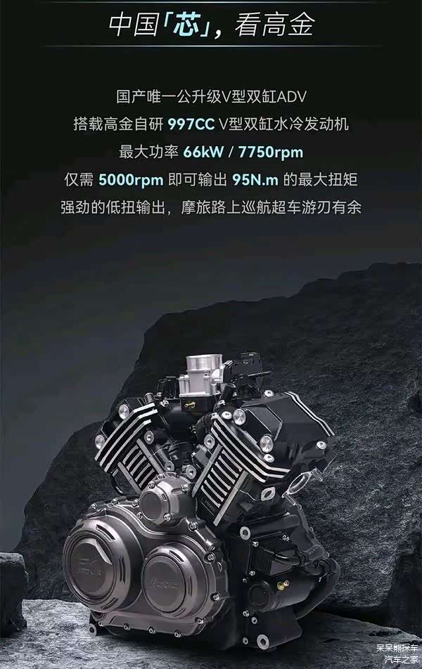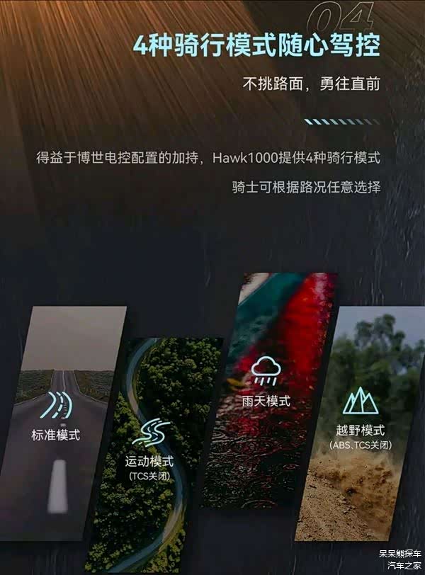 2024款高金Hawk 1000搭载排量为1000cc的双缸V型发动机,匹配国际6挡,最大功率66千瓦,峰值扭矩95牛·米,最高车速为198km/h。官方数据显示,该车的油箱容积为20升,最高续航里程约为400公里。此外,2024款高金Hawk 1000提供标准、运动、雨天和越野四种骑行模式,可根据实际骑行情况进行选择。其中,在运动模式下,TCS可关闭;在越野模式下,ABS和TCS均可关闭。还有跛行模式,也就是在ECU检测到系统故障时,限制发动机转速,从而保障骑士能安全的到达维修点。