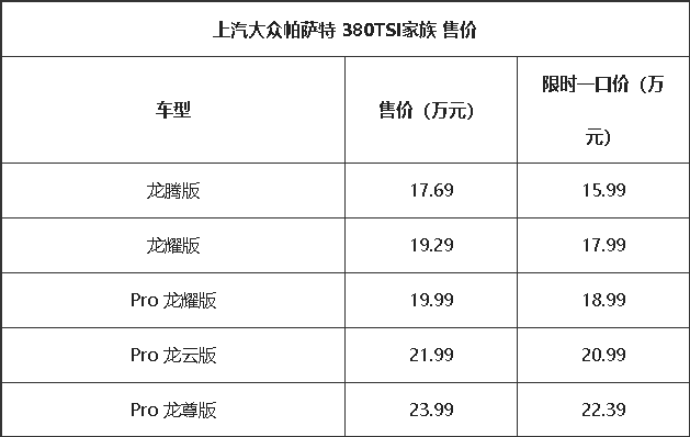 9 月 10 日,上汽大众全新一代 帕萨特 380TSI 家族正式上市,全系共 5 款车型,售价区间为 17.69 - 23.99 万元,官方还推出限时一口价,区间为 15.99 - 22.39 万元。未来,帕萨特将采取新老同堂销售的策略。帕萨特 Pro 延续海外版 Passat B9 设计风格,提供先锋版和星空版两种造型,满足不同用户需求。