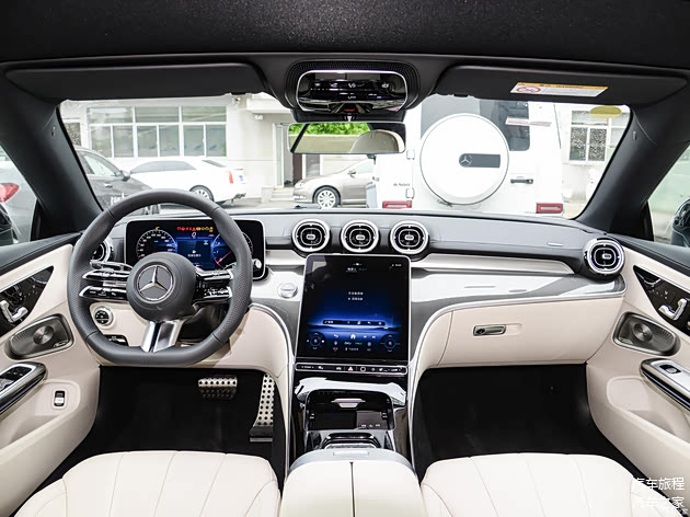 奔驰CLE沿用了奔驰E级家族式的造型设计,中控台正中是三颗个性分明的空调出风口,出风口下方则是非对称布置的倾斜中控大屏,CLE采用了12.3英寸仪表屏+11.9英寸中控大屏的配置组合,实用且拥有非常优秀的交互效果,车内大量的氛围灯灯带装饰,高级感十足。 座椅采用了菱格纹的设计,除豪华型车型配置真皮座椅外,其余均需要花2万元选装。舒适配置方面,全系均带座椅加热,但座椅通风均需花费8600元选装。