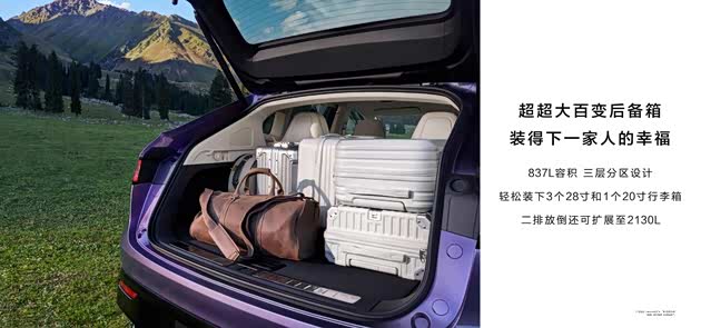 超大后备箱可轻松装下4个28英寸行李箱、1个高尔夫球包和其他,满足旅行、露营全家储物需求。后备箱盖板下方采用双暗格设计,容积分别达到56L和20L,隐私物品轻松收纳。后备箱配备了一键调节车身高度功能,轻松装载、轻松拿取。标配硬质遮物板、双滑轨,结合首销期赠送的定制储物箱、行李限位器、皮质腰靠、皮质腿托垫,可选装的多功能装载托盘、山海坐席等专属定制化配置,解锁更多出行场景。