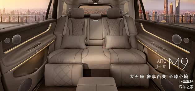问界M9大五座,内总乘用空间达到3500mm,二排腿部空间可拓展至1985mm,奢阔空间超越同级。问界M9大五座内饰精致不凡,绗缝工艺,采用优质Nappa真皮、天然实木等上乘材质,全系标配舒云座椅,具备座椅加热、通风、按摩功能,二排座椅配备可四向电动调节双腿托,最大调节角度达75°,座椅靠背最大调节角度达43°,配合柔软细腻的头枕、腰靠及腿托垫,让每一次落座皆如舒享云端。