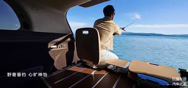 问界M9大五座副驾座椅可一键折叠放平,配合二排座椅展开,打造双奢合璧的总统空间;双人沙滩椅模式配合投影巨幕系统,形成舒适观影厅。