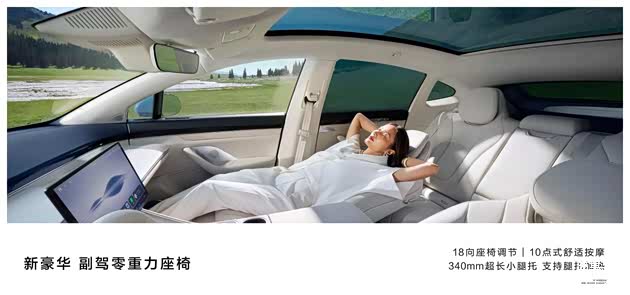 智界R7副驾驶位配置零重力座椅,支持18向座椅调节、10点式舒适按摩,并拥有340mm超长小腿托,支持一键打开。前门车窗采用双层超厚隔热玻璃、后门车窗采用双层隐私玻璃,更隔热、更安静、更私密。全景大天幕搭配电动遮阳帘,既能拥有通透空间感,又能实现100%物理防晒。