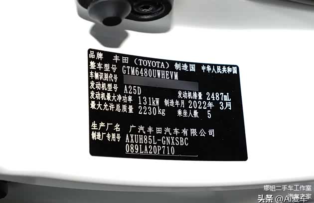 丰田威飒 2022款 双擎 2.5L CVT四驱至尊版本,使用油电混合,搭载178马力、221牛.米的2.5L自然吸气发动机,和一台174马力、323牛.米的永磁/同步电动机,变速箱匹配E-CVT无级变速、最高车速180km/h、NEDC综合油耗5L/100km、油箱容积55L。